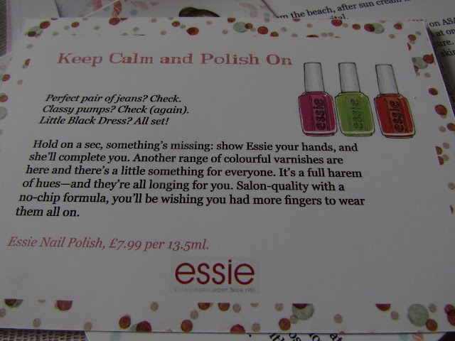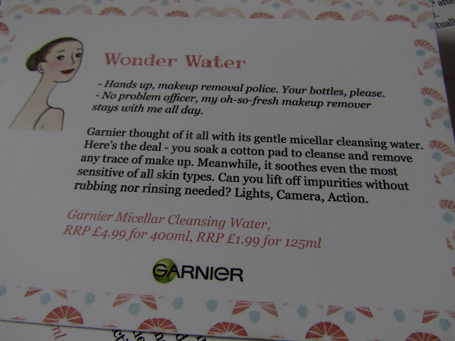 wasn't sure if I was excited to try the make-up or whether I would just have to give them away to my sister. This months box didn't come any beauty products I did not want. There was a pink essie nail varnish called, "Bottle Service" it is a bright pink colour which looks slightly better in person than online. A Garnier cleansing water, I presume this is the smaller size for traveling as that is the theme with this box. It is described as an all-in-one cleanser to lift away dirt from your skin which sounds very good to me, I'll look forward to using that soon.