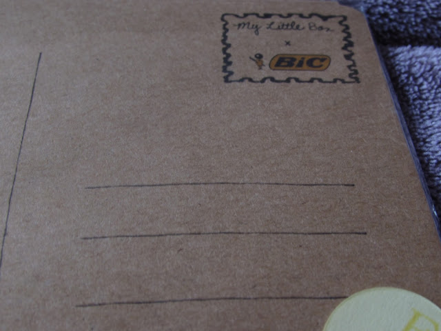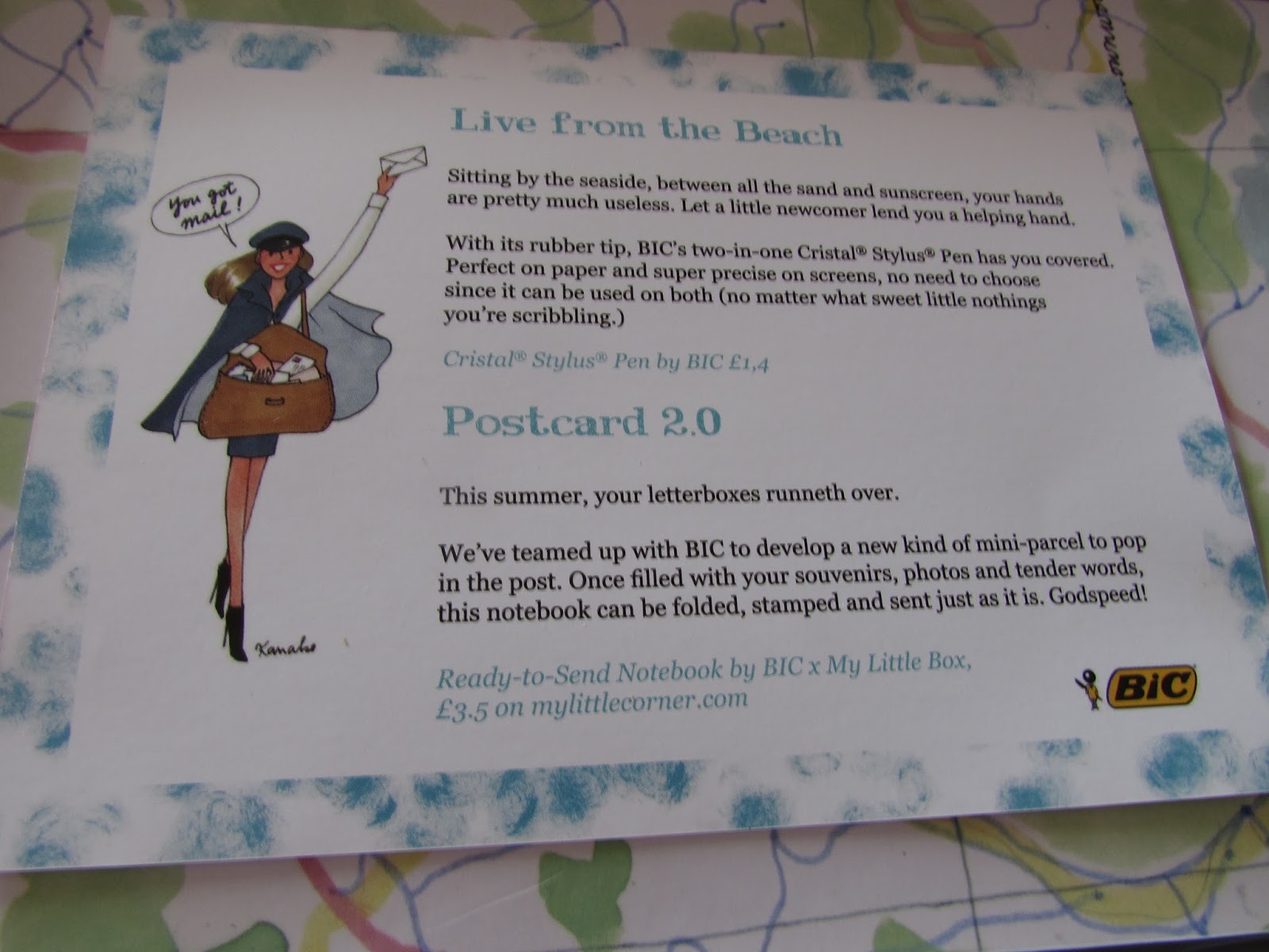 The lifestyle products included a small material bag with pink stars and My Little Box on the bag, a travel organiser with sections for things like you purse and passport that are beautifully drawn onto the organiser, a cute little postcard envelope that you can write holiday memories in to post to a friend and a fancy bic biro with a stylus at the end and a shiny silver pattern on the pen.